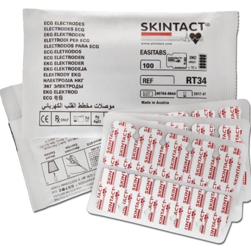 Легкі компактні одноразові електроди Skintact RT34 призначені для коротко контактного ЕКГ у положенні лежачи під прищіпкою. Основа виготовлена з паперу з надійним шаром гелю, що добре проводить. Вони не тільки легко, швидко кріпляться до апарату і на шкіру, але так само легко знімаються. Не залишають слідів, не виривають волосся, не викликають алергічних реакцій.